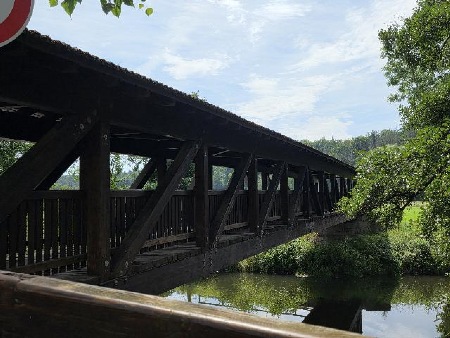 Eine abenteuerliche Überquerung des Lech:Unser Google-Navi führte uns in Richtung Oberndorf am Lech. Dazu musste der Lech bei Rain überquert werden. Nicht verzeichnet war, dass dazu im E-Werk Rain zwei Treppen überwunden werden mussten, um auf den Gittersteg über den Fluss zu gelangen. Aber mit Hilfe eines dortigen Beschäftigten haben wir auch diese nicht vorhergesehene Hürde gemeistert und konnten die Fahrt auf der anderen Seite fortsetzen.
