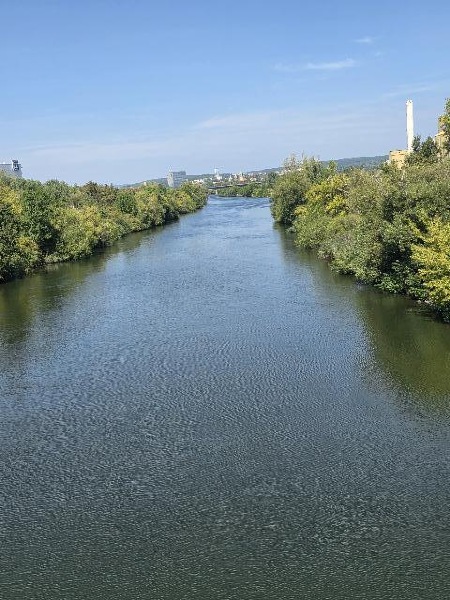 Der Main fließt in vielen Schlingen in westliche Richtung und mündet nach 527 km bei Mainz in den Rhein.