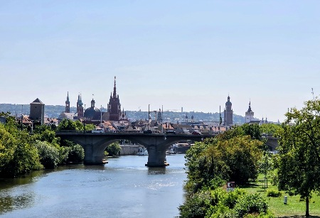 Der Main fließt in vielen Schlingen in westliche Richtung und mündet nach 527 km bei Mainz in den Rhein.